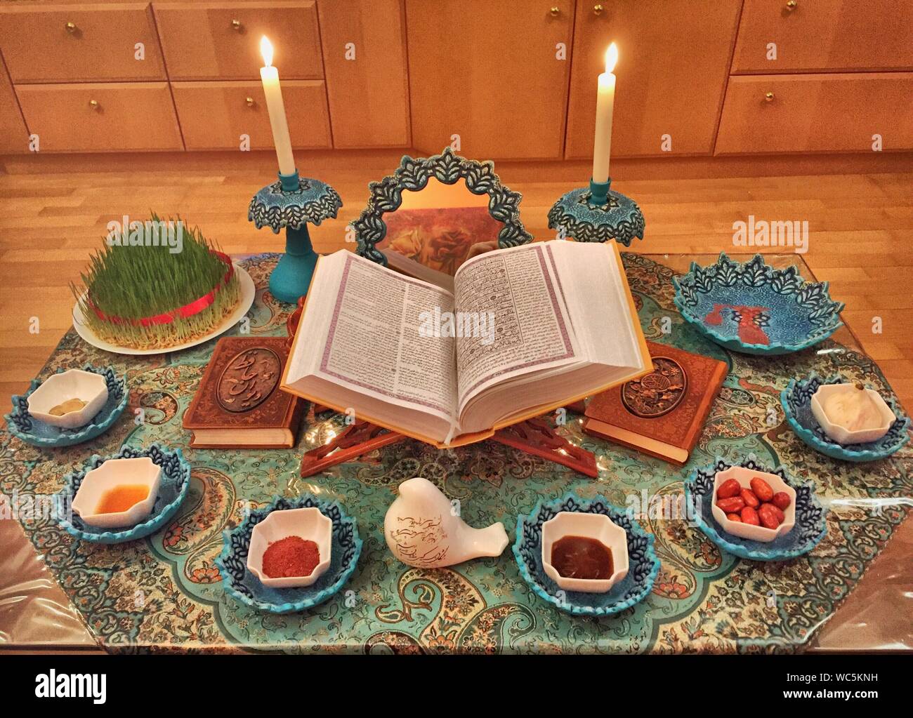 Hohe Betrachtungswinkel Des Koran Inmitten Von Lebensmitteln Und Kerzen Auf Teppich Wahrend Nowruz Stockfotografie Alamy